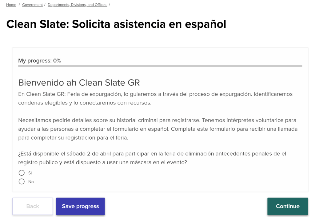 Amanda designed three forms: volunteer sign up, expungement registration, and request for assistance in Spanish. The forms were built with if/then logic, to block ineligible submission logic, to automate confirmation emails, and provide template sheets for registration forms. The logic automates eligibility confirmation and prevents ineligible applicants from submitting a file, saving staff time and eliminating the need for individual eligibility validation and callbacks. The forms also send confirmation emails that include reminders and details to set expectations for the volunteers and event attendees. The confirmation email included a template call to action to share the registration with friends, families and others.